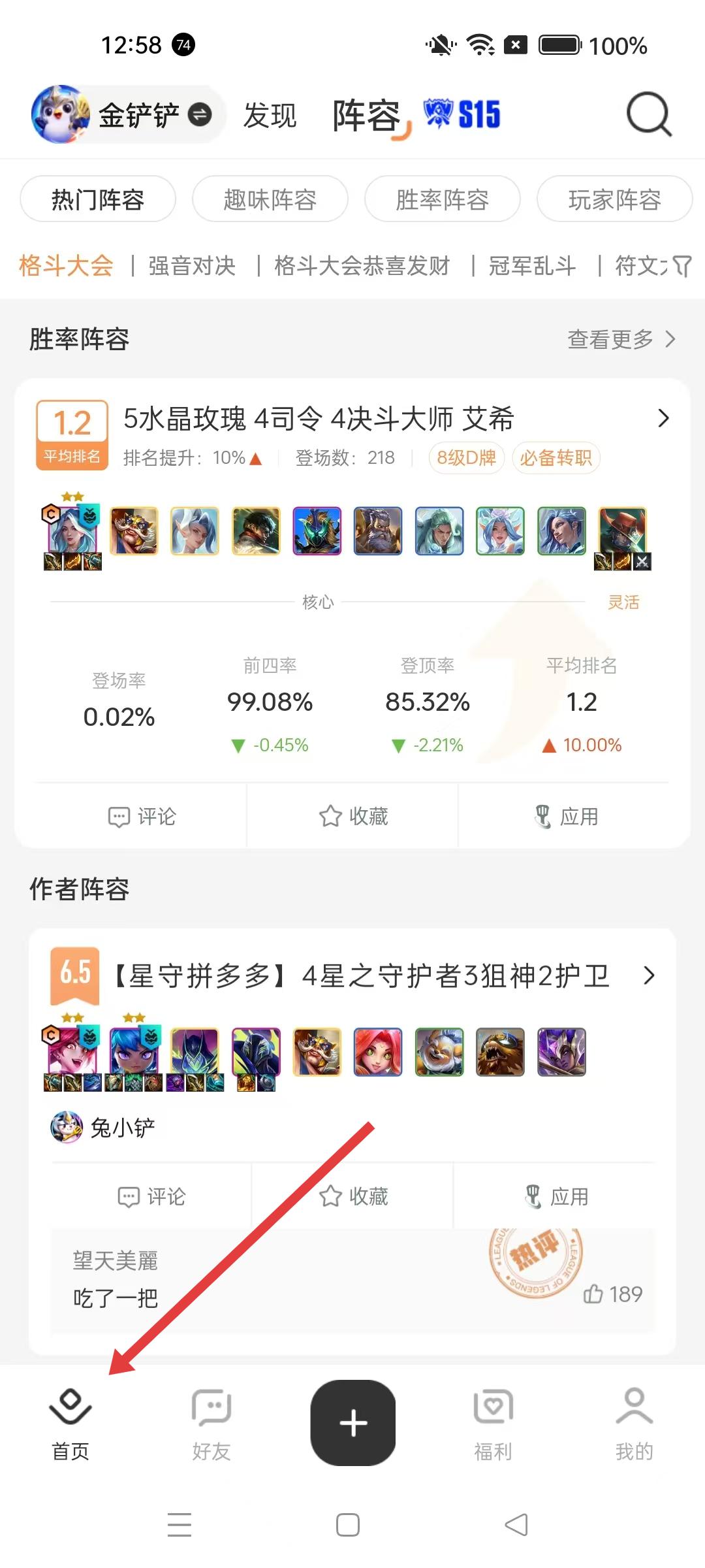 1、打開掌上英雄聯盟金鏟鏟之戰板塊,進入首頁可查看熱門陣容、勝率陣容等游戲陣容推薦,了解游戲玩法策略。
