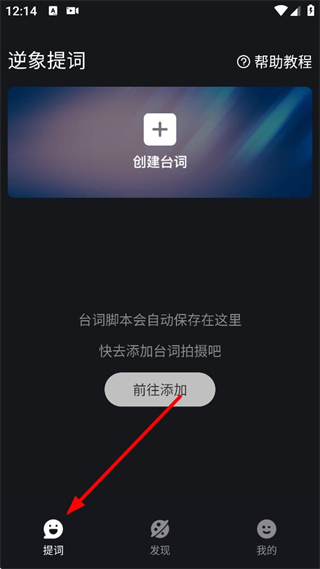 1、打開逆象提詞APP,進入提詞板塊,可點擊創建臺詞,也可前往添加臺詞腳本,方便進行提詞創作。
