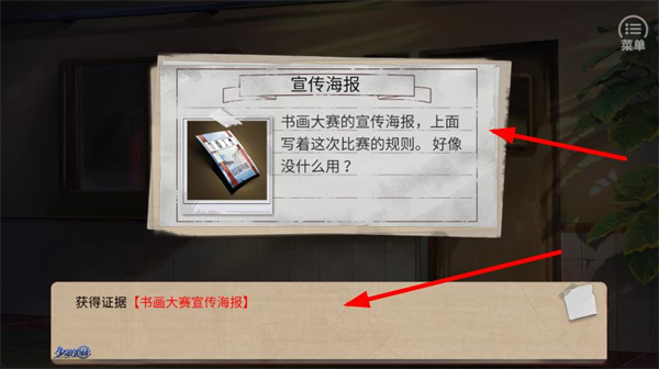 1、獲得書畫大賽宣傳海報等證據,收集證據為案件辯護提供線索,推進解謎進程。