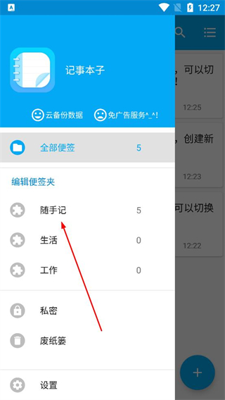 1、打開軟件進入主界面,點擊右上角菜單按鈕,展開功能列表,選擇隨手記分類,進入對應便簽頁面。