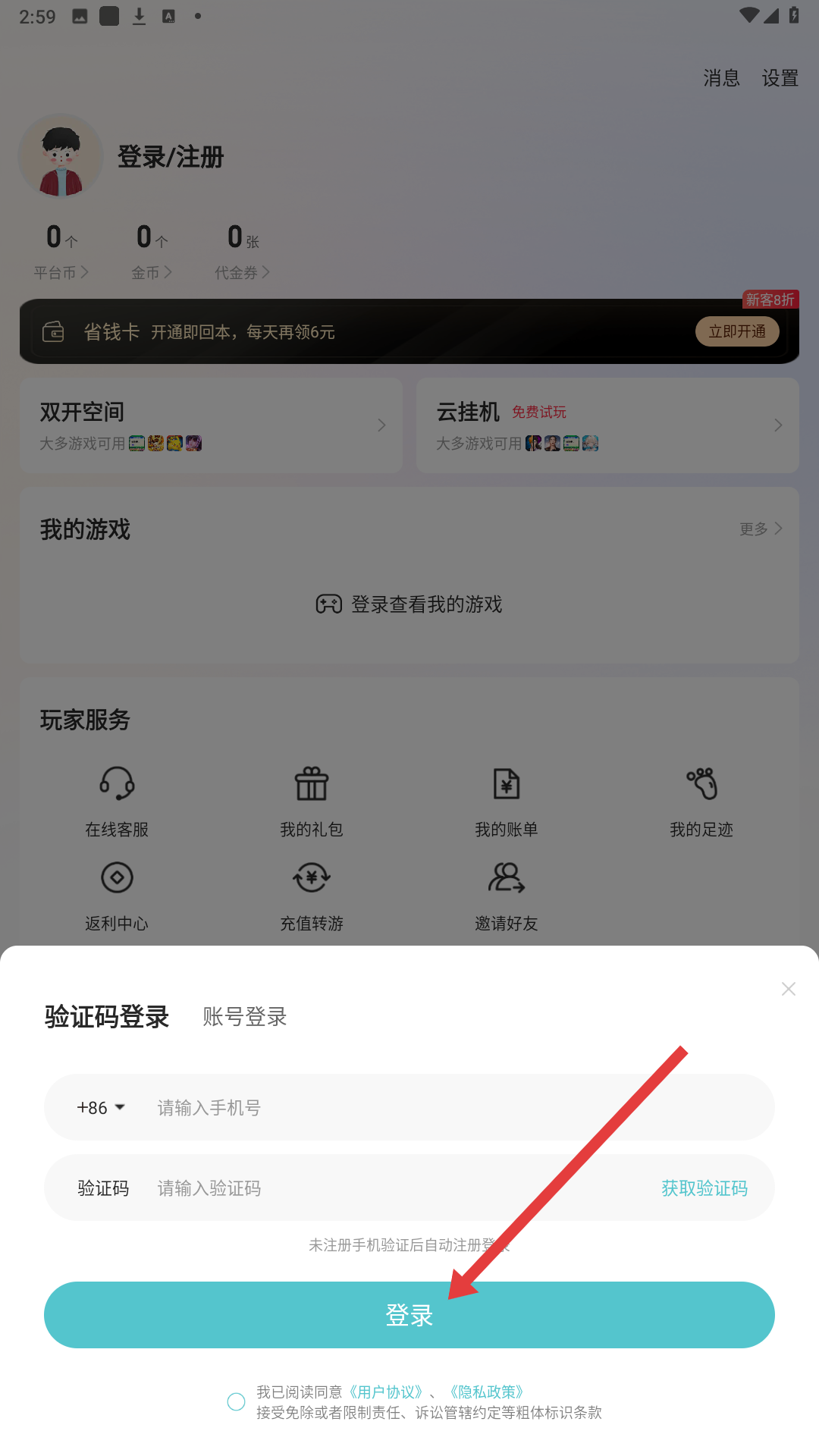 3、登錄時選擇驗證碼登錄,輸入手機號和驗證碼,勾選同意用戶協議和隱私政策后,點擊登錄按鈕,完成賬號登錄。