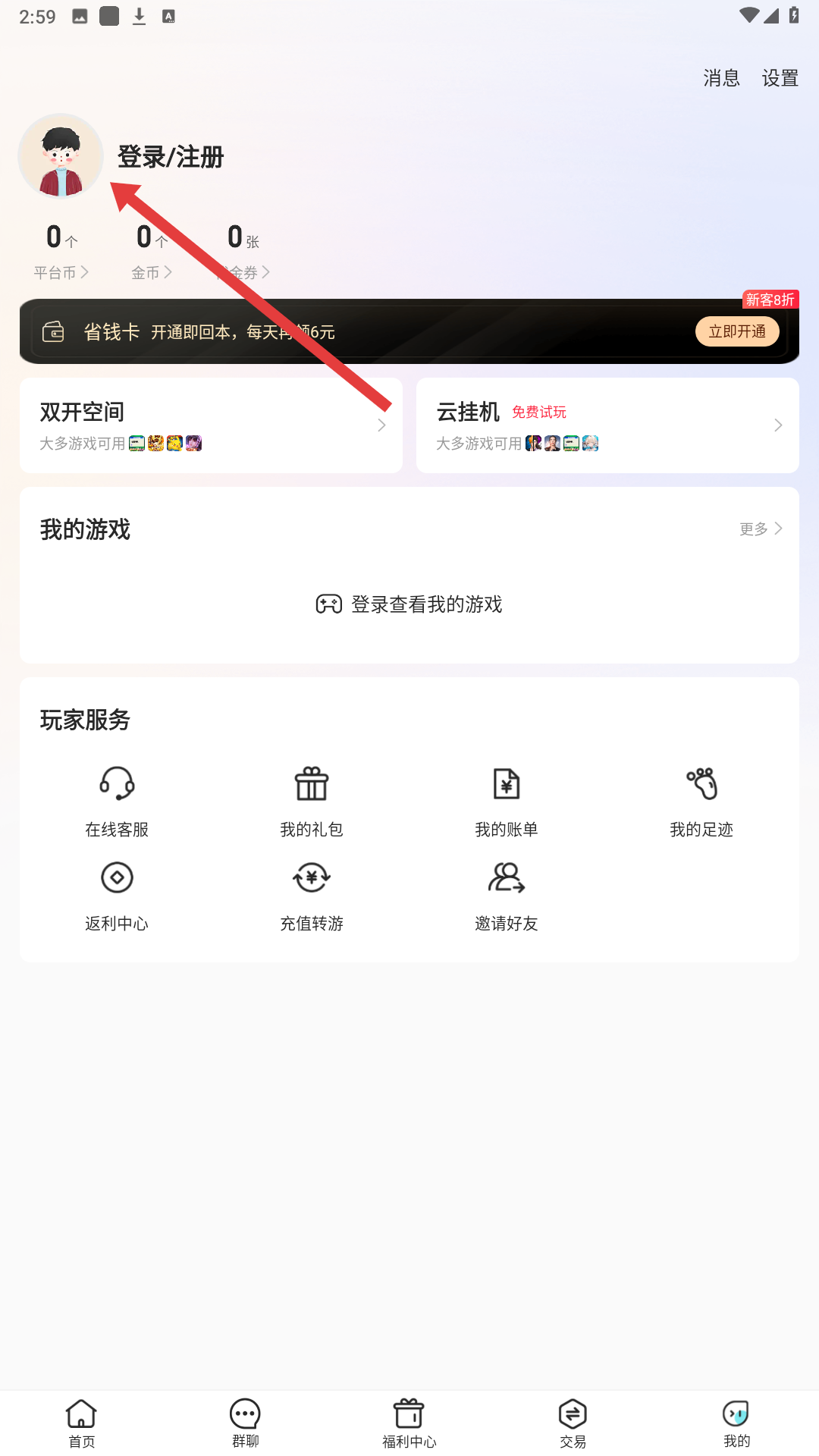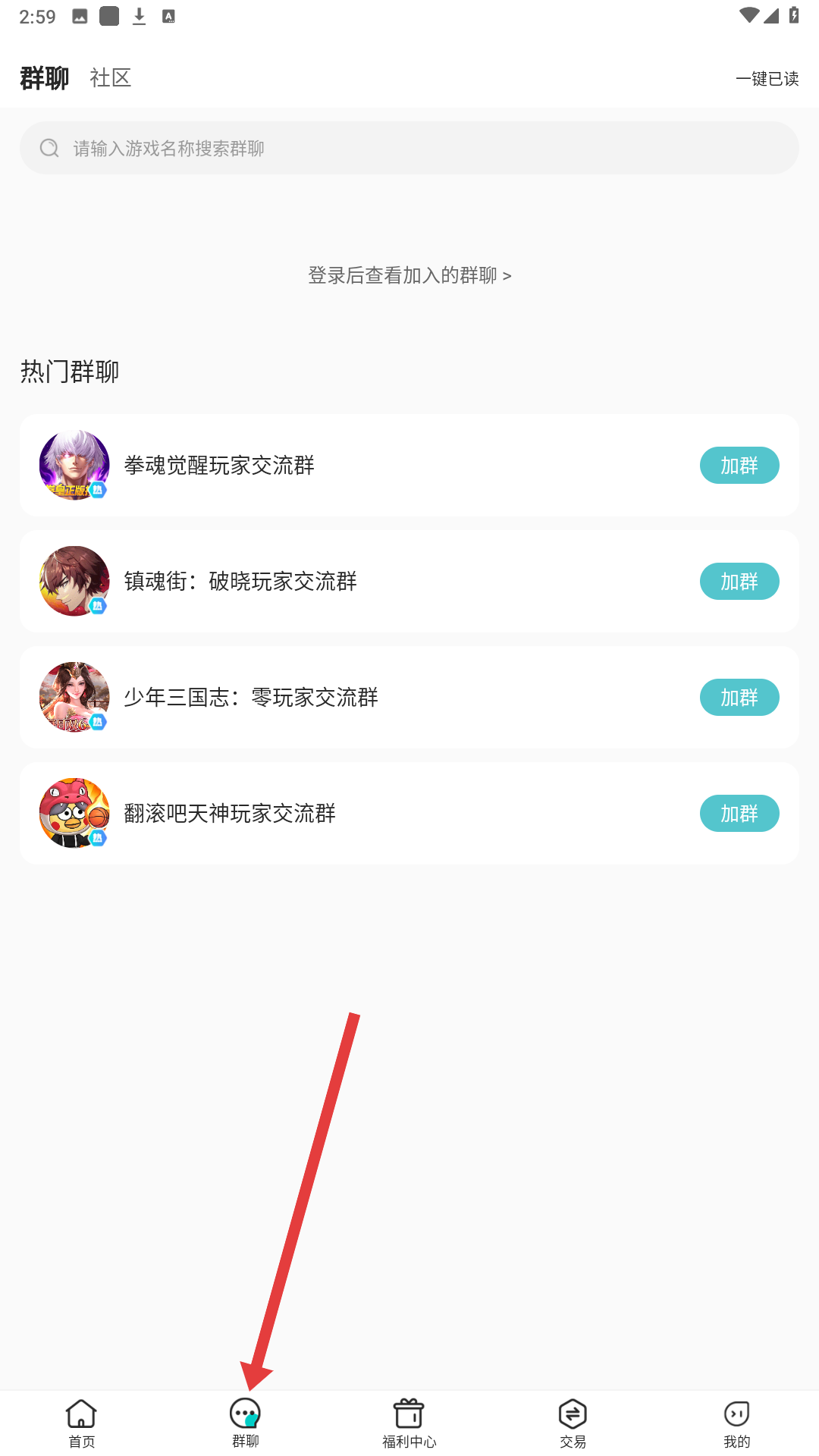 1、進入平臺群聊界面,可看到熱門群聊如拳魂覺醒玩家交流群等,點擊我的進入個人中心,準備進行登錄操作。