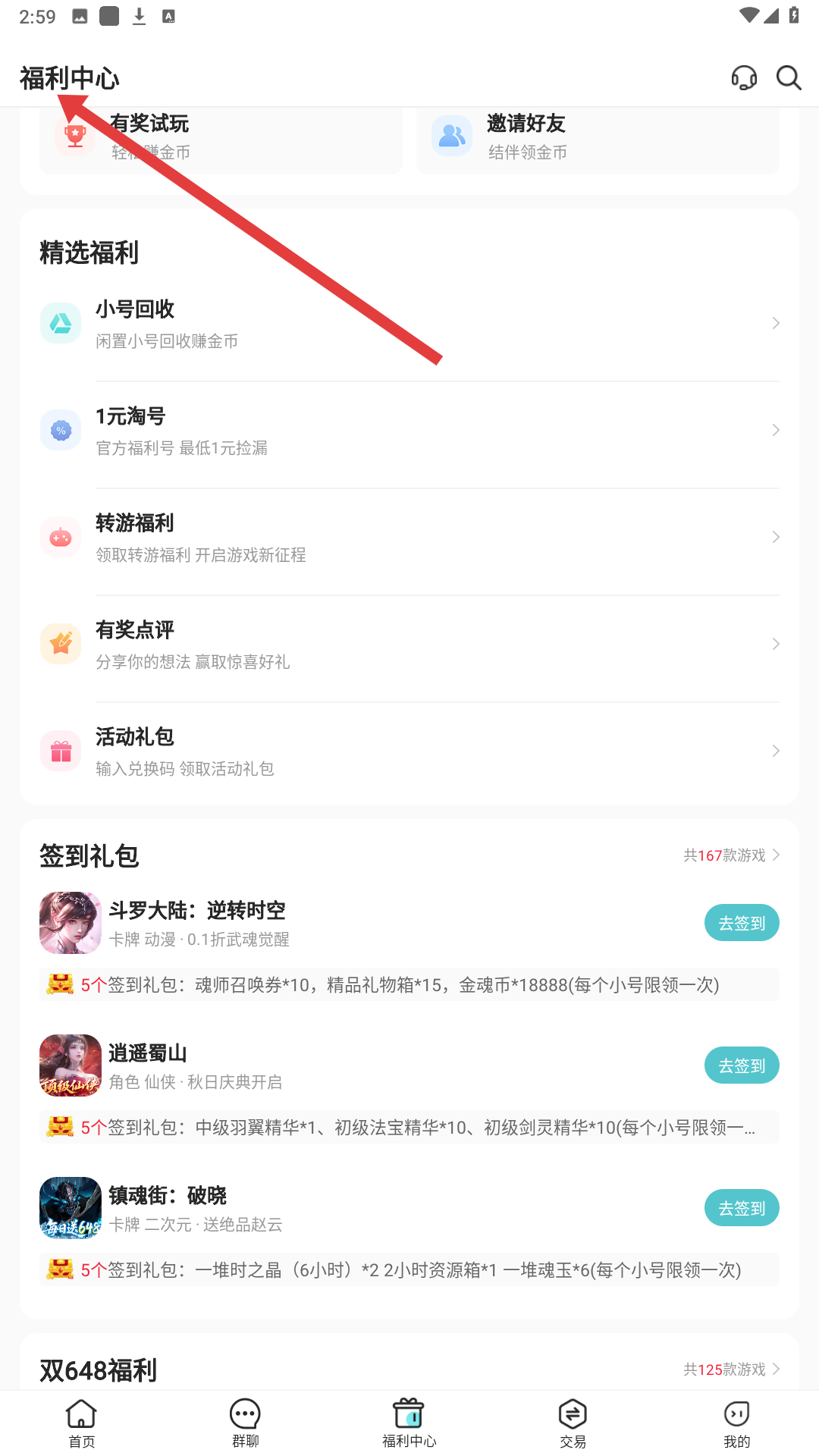 4、登錄后進入福利中心,可看到精選福利、簽到禮包等內容,如小號回收、1元淘號等福利,還可領取斗羅大陸逆轉時空等游戲的簽到禮包。