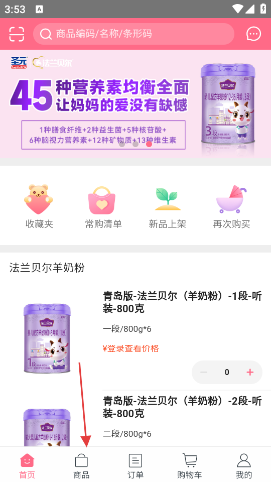 1、打開APP首頁,查看法蘭貝爾羊奶粉產品,利用收藏夾、常購清單等功能,瀏覽新品上架與再次購買板塊,了解產品營養信息。