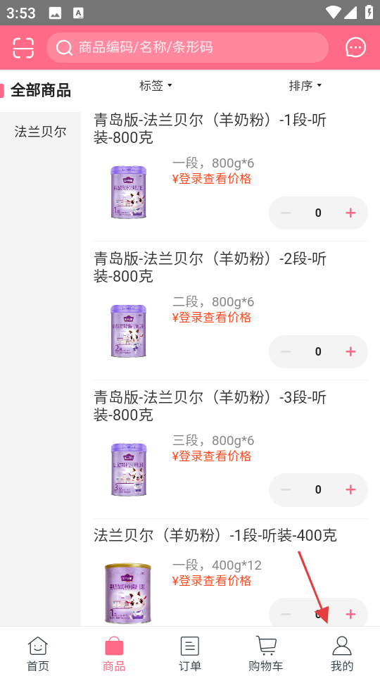 2、切換至商品頁面,查看全部法蘭貝爾羊奶粉系列,包含不同段數、規格產品,點擊加減號調整購買數量,準備選購商品。