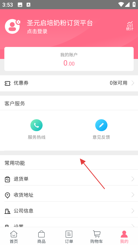 3、進入我的頁面,查看賬戶余額、優惠券,使用服務熱線、意見反饋功能,通過退貨單、收貨地址等常用功能,管理訂貨相關信息。
