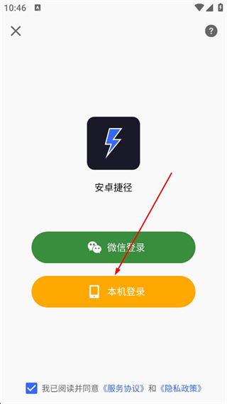 1、打開安卓捷徑軟件,勾選已閱讀并同意相關協議,選擇本機登錄方式,點擊對應按鈕完成賬號登錄,進入軟件個人中心頁面。