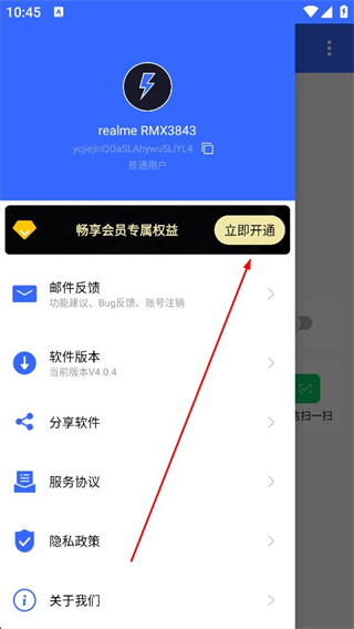 3、在個人中心頁面查看郵件反饋軟件版本等功能選項,點擊立即開通按鈕,進入會員開通頁面查看會員權益內容。