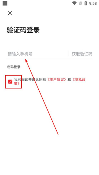 4、若分享需要登錄則進入驗證碼登錄頁面,輸入手機號,勾選用戶協議和隱私政策,準備獲取驗證碼完成登錄。