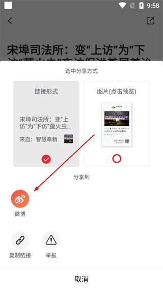 3、在分享界面選擇鏈接形式再選擇微博渠道分享該資訊,也可復制鏈接,完成操作后點擊取消關閉分享彈窗。