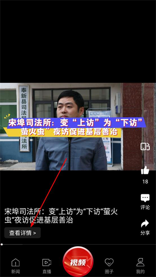 1、打開軟件進入新聞頁面,選擇宋埠司法所相關的視頻資訊,點擊查看詳情按鈕,進入該資訊的播放頁面。
