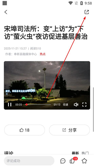 2、在資訊播放頁面,觀看視頻內容,可點擊點贊按鈕互動,再點擊分享按鈕進入分享方式選擇界面。