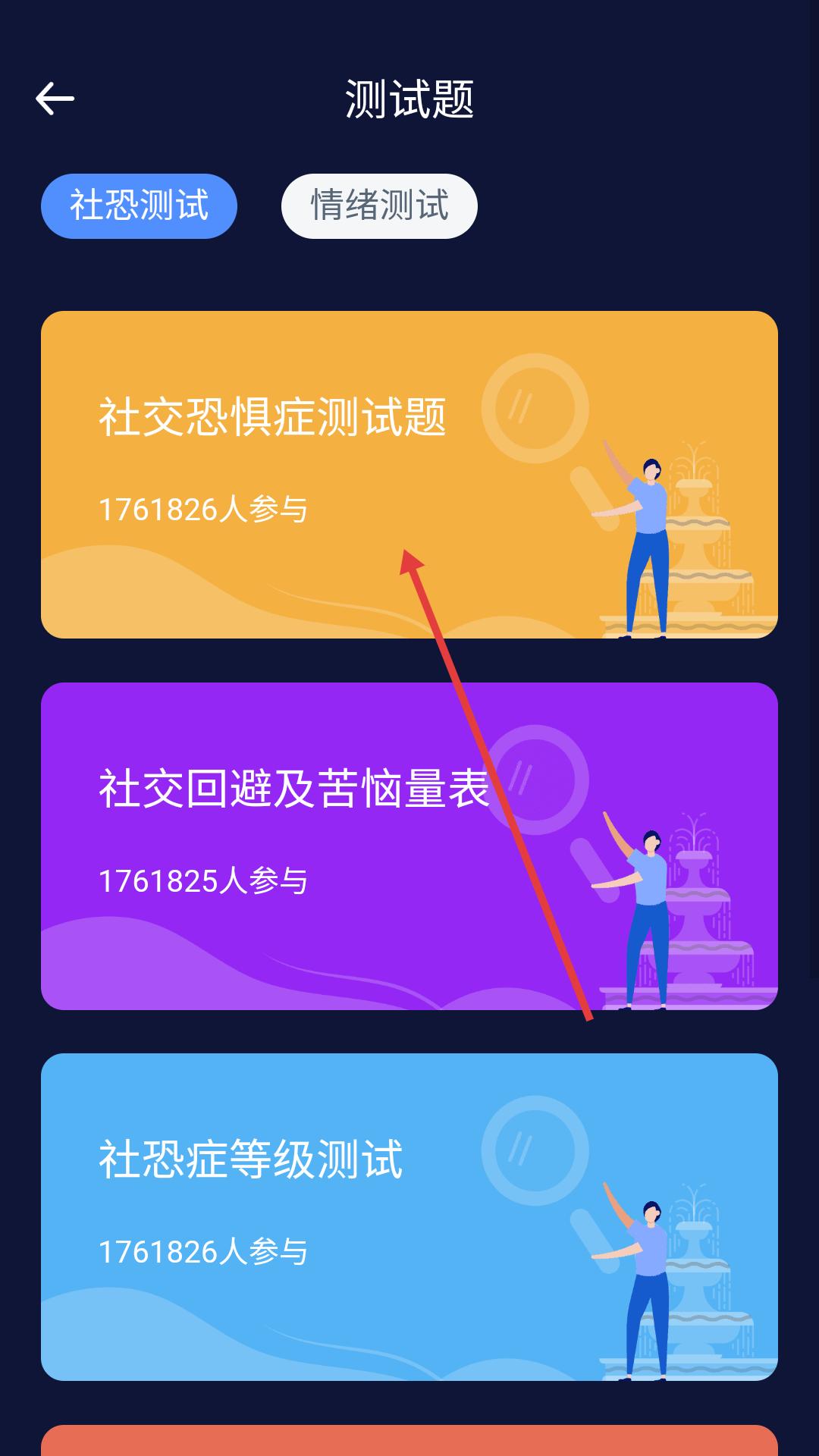 3、點擊應用測試題頁,分社恐與情緒測試,含多測試項目及參與人數,供用戶了解自身社交情緒狀態。