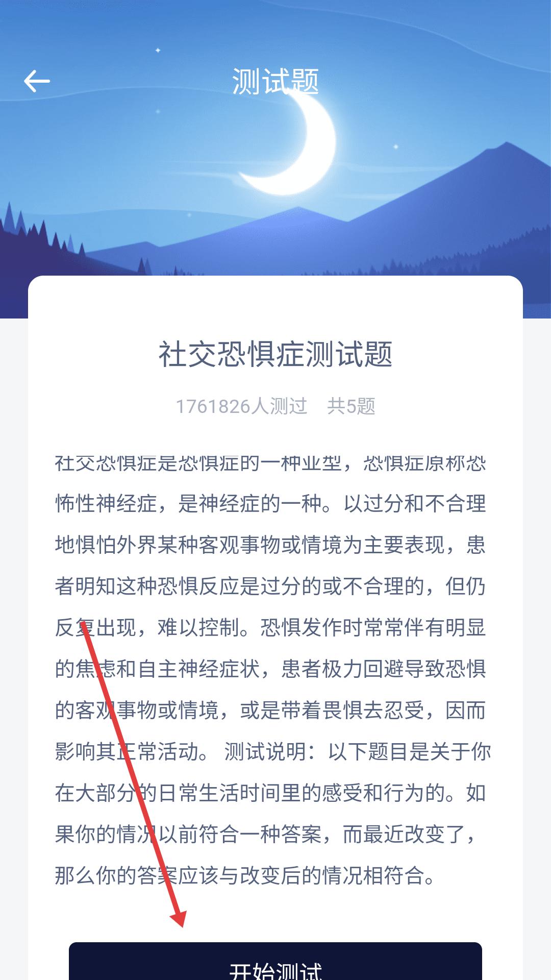 4、進入社交恐懼癥測試題詳情界面,可查看測試說明,點擊開始測試即可進行社交恐懼癥測試。