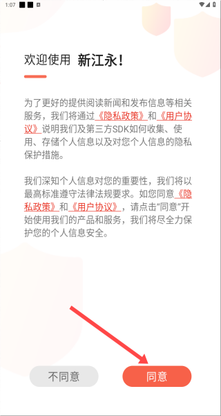 1、新江永APP彈出隱私政策和用戶協議提示,強調信息保護,點擊同意接受條款,進入APP主界面。