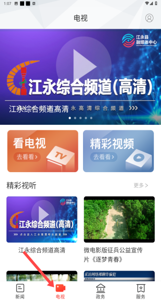 3、新江永APP電視板塊,展示江永綜合頻道等視聽內容,有看電視精彩視頻等功能入口。