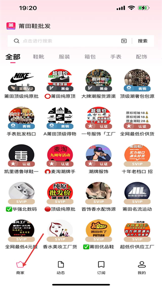 1、莆田鞋服批發APP商家頁,有鞋靴等分類,有莆田頂級純原批等商家入口,涵蓋鞋服箱包等多品類批發渠道。