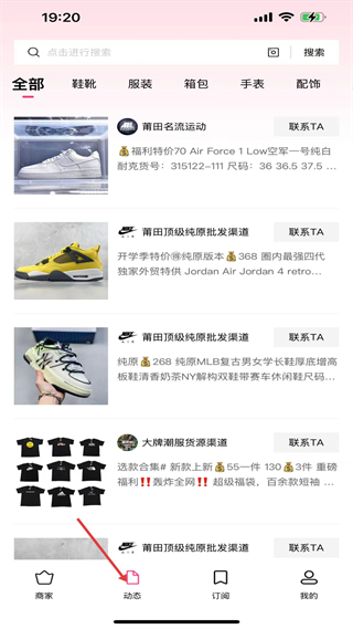 2、動態頁呈現商品動態,有莆田名流運動的空軍一號鞋、莆田頂級純原批發渠道的Jordan鞋及大牌潮服選款合集。