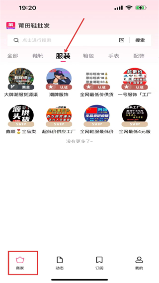 3、商家頁服裝分類,展示大牌潮服貨源渠等服裝類商家,提供各類潮牌服裝批發渠道。