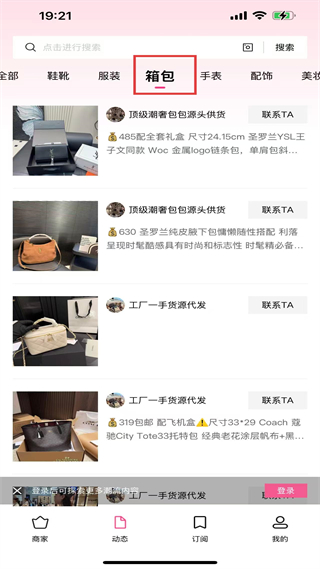 4、動態頁箱包分類,展示頂級潮奢包包源頭供貨等商家的箱包,有圣羅蘭、蔻馳等品牌,標注價格配置。