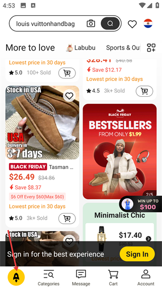 1、首頁,搜索欄輸了品牌包關鍵詞,展示黑五促銷商品,標30天低價及折扣,底部設導航,提示登錄體驗更佳。