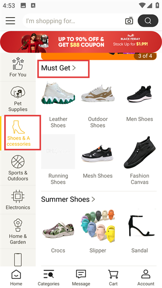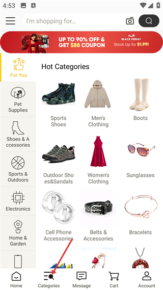 2、分類頁,左側列全部分類,右側展熱門品類,頂部有黑五橫幅,可快速進入對應品類瀏覽商品。