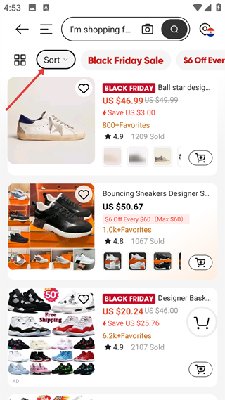 4、商品列表頁,標黑五折扣價及優惠,展商品評分銷量,頂部有排序功能,支持添加購物車。