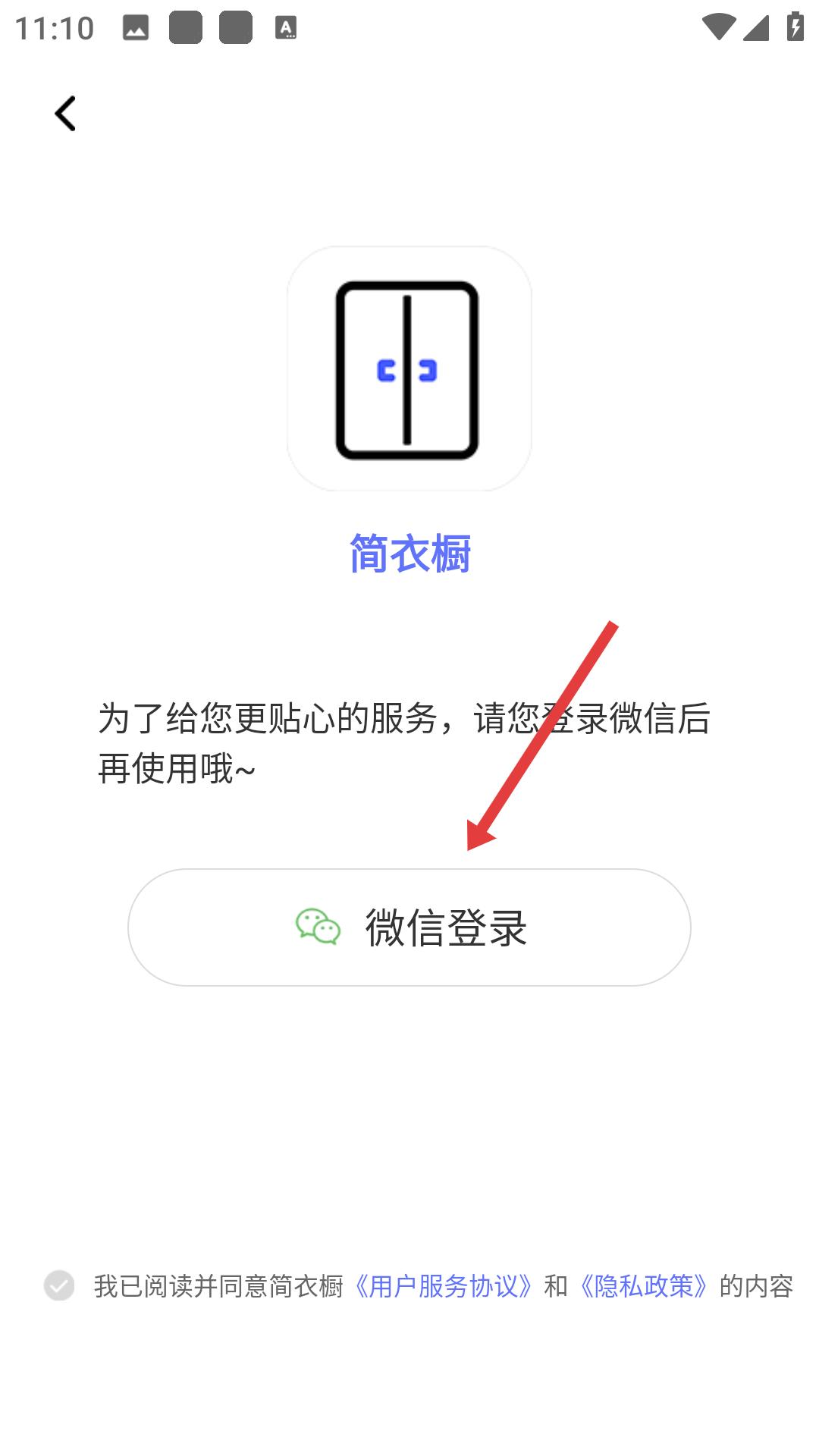 3、在簡衣櫥登錄界面,需勾選同意相關協議,然后點擊微信登錄,通過微信賬號登錄后即可享受更貼心的服務。