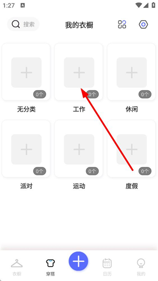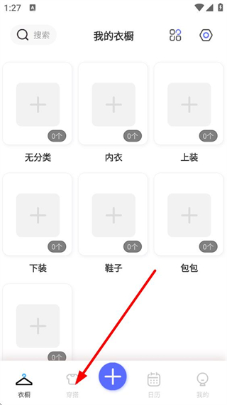 1、進入我的衣櫥頁面,展示無分類內衣等衣物分類板塊,各分類當前物品數為0,點擊底部穿搭選項,進入穿搭分類頁面。