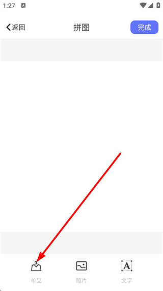 3、進入拼圖頁面,頂部有返回和完成按鈕,底部設單品照片文字功能選項,可選擇對應功能開展穿搭拼圖編輯。