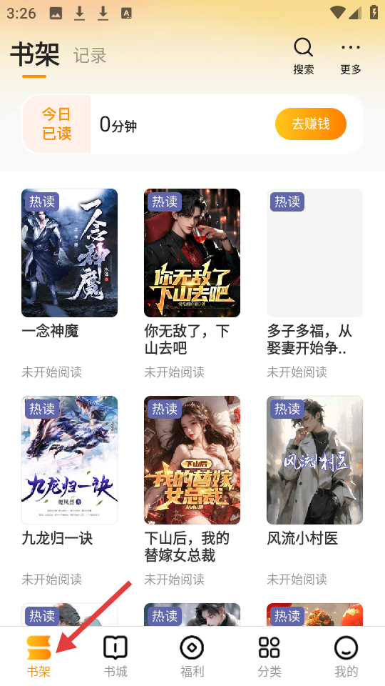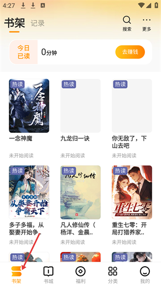 1、書架界面顯示今日已讀0分鐘,有去賺錢按鈕,排列著一念神魔等熱讀書籍,狀態為未開始閱讀。