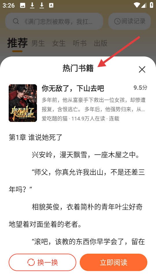 2、書籍介紹頁以你無敵了,下山去吧為例,展示評分、簡介及首章內容,可選擇換書或立即閱讀。