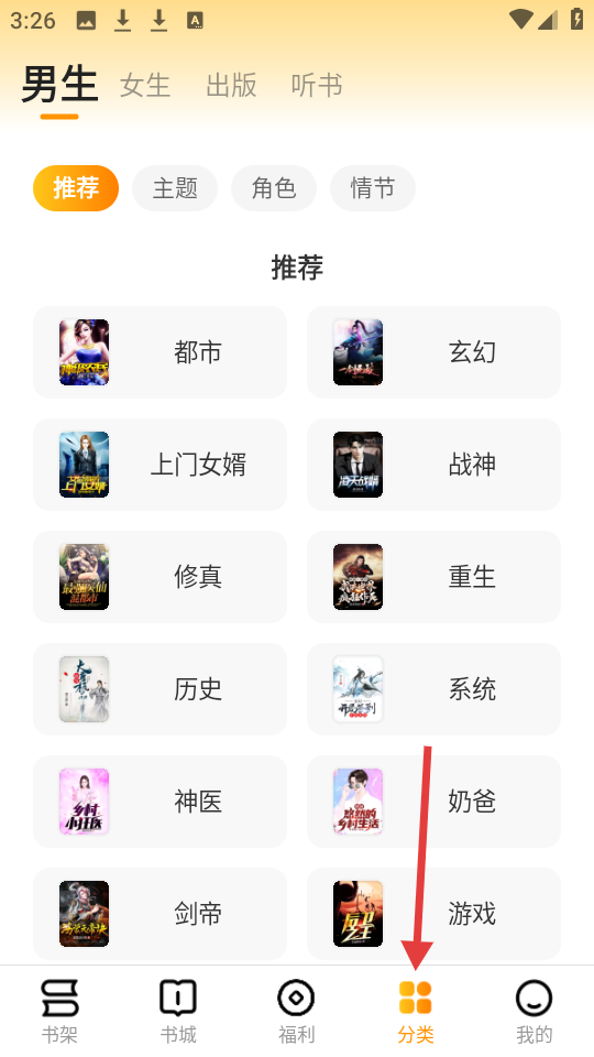 3、分類界面涵蓋男生、女生等分類,推薦下有都市、玄幻等類型,底部有書架、書城等導航欄。