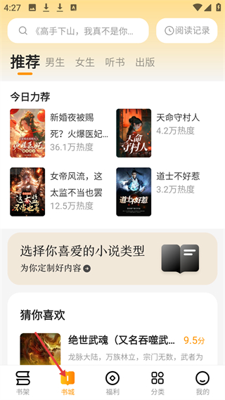 2、書城板塊,有推薦等頻道,今日力薦新婚夜被賜死、火爆醫妃等小說,還有猜你喜歡欄目,可定制小說內容。