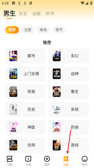 3、分類板塊男生頻道,涵蓋都市、玄幻等多種類型,支持按主題等篩選,方便男生查找心儀小說。