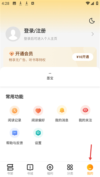 4、我的板塊,可登錄注冊,開通會員享特權,有閱讀記錄等常用功能,還可進行幫助反饋和設置操作。