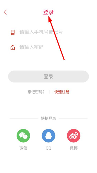 3、登錄頁面,可輸入手機號或賬號、密碼登錄,也可選擇微信、QQ、微博等快捷登錄方式,若忘記密碼可選擇快速注冊。