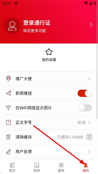 2、點擊底部我的按鈕,進入個人頁面,可進行登錄,使用我的收藏功能,還能設置新聞推送、正文字號等,管理個人使用偏好。
