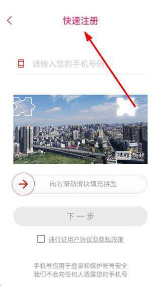4、快速注冊頁面,輸入手機號碼,完成拼圖驗證,閱讀并同意相關協議后點擊下一步,完成賬號注冊流程。