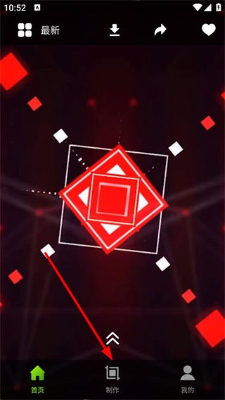 1、進入應用首頁,可看到動態壁紙展示界面,頂部有最新、下載等功能按鈕,底部有首頁、制作、我的功能按鈕,點擊制作可進入制作頁面。