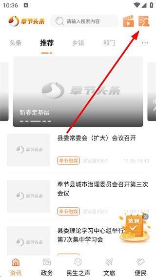 1、進入奉節頭條首頁,可瀏覽推薦類資訊內容,頂部有搜索欄,底部有資訊政務等功能入口,點擊右上角頭像,即可進入個人中心頁面。
