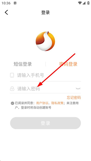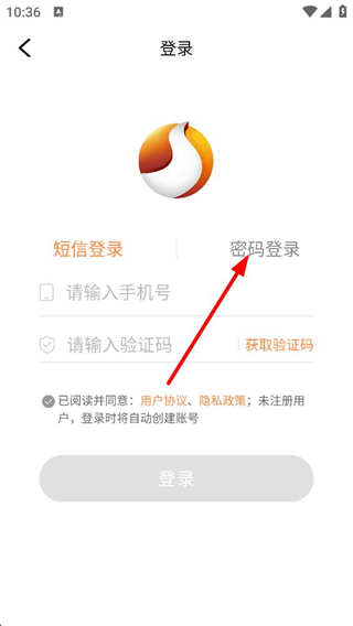 3、進入登錄界面默認顯示短信登錄方式,可輸入手機號獲取驗證碼完成登錄,未注冊用戶登錄時會自動創建賬號,也能點擊密碼登錄切換方式。