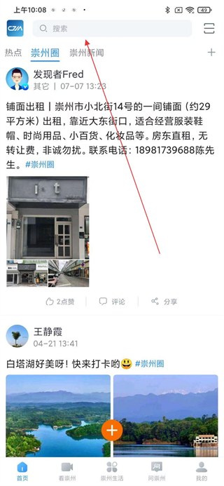 1、打開今日崇州app進入首頁,瀏覽熱點崇州圈等分類內容,選擇感興趣的動態內容,也可以點擊上方的搜索框搜索。