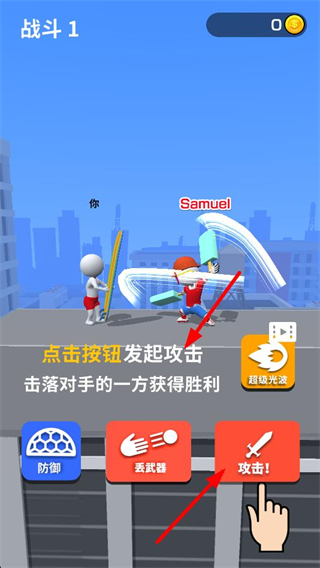 2、與對手Samuel對戰,界面有防御丟武器攻擊按鈕,點擊按鈕發起攻擊,擊落對手的一方就能獲得戰斗勝利。