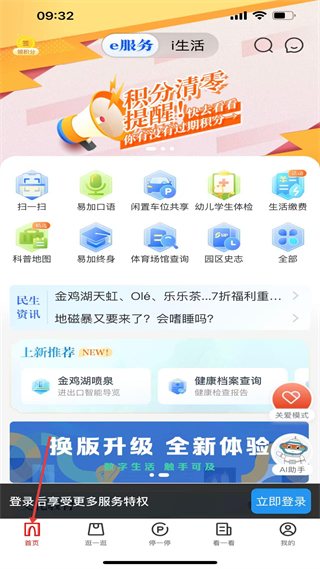 1、首頁,有e服務i生活板塊,提供掃一掃等服務入口,展示民生資訊與上新推薦,還有積分清零提醒及AI助手功能。