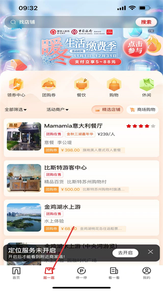 2、逛一逛界面,有領券中心等分類,展示多家商戶團購信息,可參與暖冬生活繳費季活動。