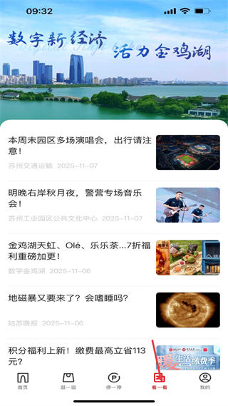 3、看一看界面,呈現金雞湖相關資訊,包括演唱會提示、音樂會、商業福利、地磁暴科普等內容。