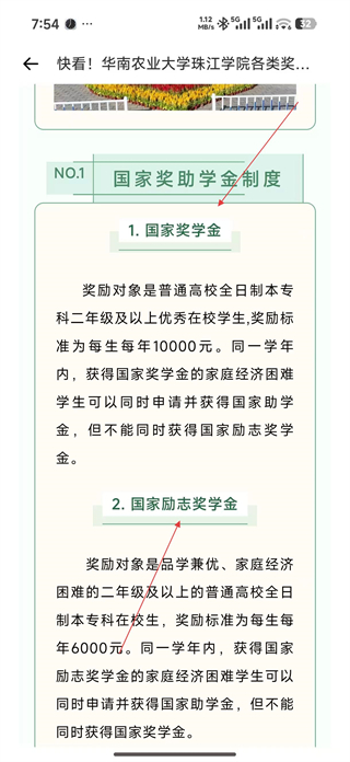 2、在助學金指南頁面點擊某一院校的獎助學金資訊,進入詳情頁后,查看國家獎學金制度的內容,了解獎勵對象及標準,明確同一年內的申請限制。