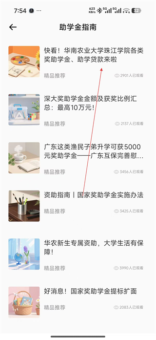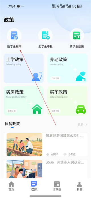 1、進入軟件政策頁面,找到助學金指南選項,點擊進入對應板塊,可查看各類助學金相關資訊,包括不同院校的獎助政策。