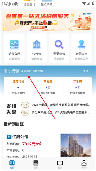 1、打開軟件進入首頁,查看銷售公示快修快供等功能,瀏覽南寧行情里的住宅均價等數據,點擊資訊頭條查看房產相關新聞。